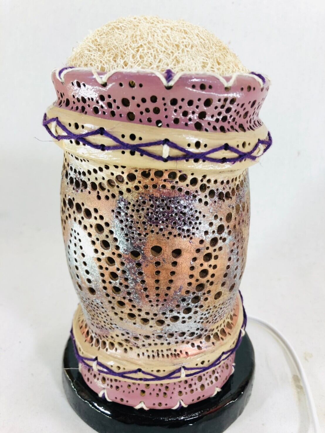 桜をイメージした淡いピンク色の漆と、銅、銀粉をまぶしたランプシェードです。
